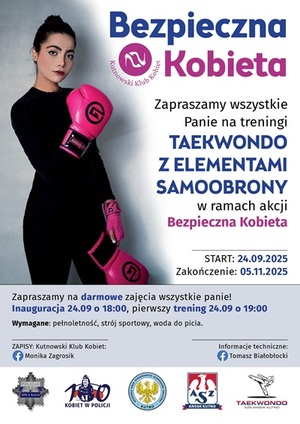Rusza kolejna edycja zajęć pn. „Bezpieczna kobieta”. Chcesz dowiedzieć się jak zadbać o swoje bezpieczeństwo? Jak unikać zagrożeń? Jak zachować się w sytuacji zagrożenia? Odpowiedź na te pytania i wiele innych otrzymają panie, które zgłoszą się na warsztaty zorganizowane przez Akademię Nauk Stosowanych Gospodarki Krajowej przy współpracy z Komendą Powiatową Policji w Kutnie oraz Stowarzyszeniem Kutnowski Klub Kobiet. Startujemy 24 września. Szczegóły na plakacie.