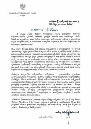 "W imieniu kierownictwa Komendy Wojewódzkiej Policji w Łodzi życzę, aby Święta Bożego Narodzenia były czasem spokoju i nadziei, a nadchodzący Nowy Rok przyniósł zdrowie, pomyślność, satysfakcję z pełnionej służby i pracy oraz bezpieczne powroty do domów po każdej z nich. "