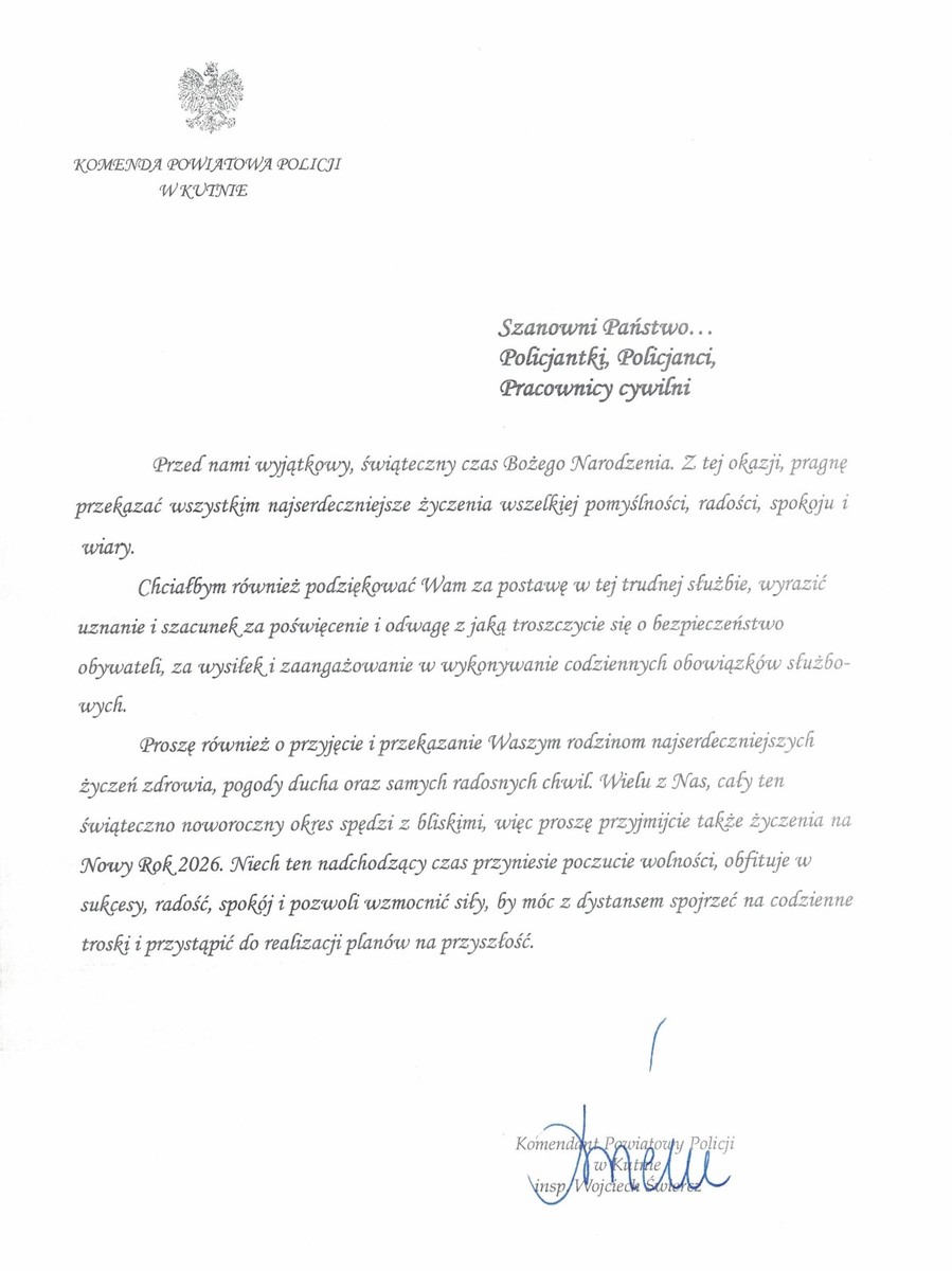 Komendant Powiatowy Policji w Kutnie insp. Wojciech Świercz składa życzenia radosnych, spokojnych Świąt Bożego Narodzenia oraz pomyślności w nadchodzącym 2026 roku.