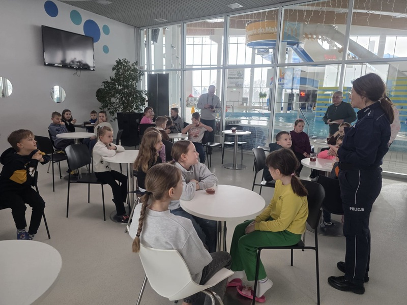 Ferie zimowe to wyczekiwany czas odpoczynku i zabawy dla dzieci. Niezależnie od jego formy, najmłodsi narażeni są na szereg zagrożeń, którym zapobiec można dzięki przestrzeganiu kilku podstawowych zasad. 10 lutego 2026 roku w ramach działań „Kręci mnie bezpieczeństwo w zimie” policjantka z kutnowskiej komendy młodszy aspirant Katarzyna Wasiak spotkała się z dziećmi i młodzieżą przebywającymi na półkoloniach w Aquaparku. Wizyta odbyła się również w towarzystwie innych służb mundurowych. Razem z przedstawicielką Policji dzieci gościli także przedstawicieli Straży Pożarnej.