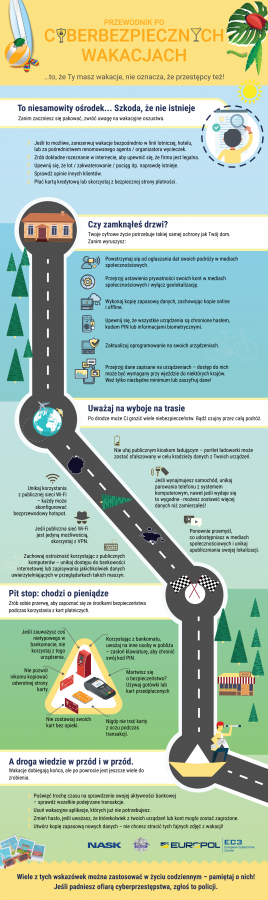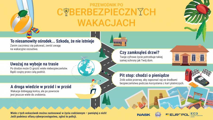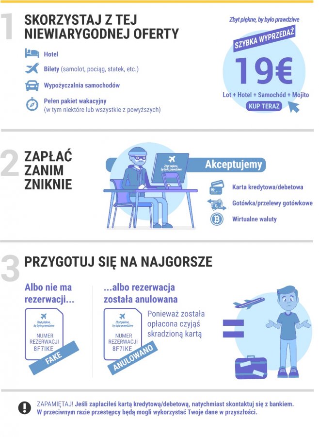 Rozpoczynają się wakacje. Planując wypoczynek trzeba zwrócić uwagę nie tylko na bezpieczeństwo w związku z zagrożeniem COVID-19. Oszuści nie próżnują, a nieprawdziwe oferty i „super okazje” mogą okazać się bardzo kosztowne. Biuro dw. z Cyberprzestępczością Komendy Głównej Policji oraz NASK (Naukowa i Akademicka Sieć Komputerowa) we współpracy z Europolem, ostrzegają przed nieuczciwymi ofertami internetowymi w przygotowanej kolejnej kampanii prewencyjnej.